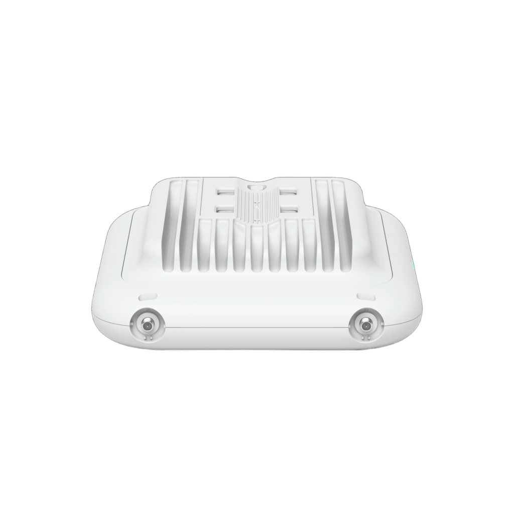 Punto de acceso WiFi 7 para exteriores con antena direccional integrada y antenas omni externas, diseñado para cobertura de largo alcance en espacios abiertos y montable en pared o poste.