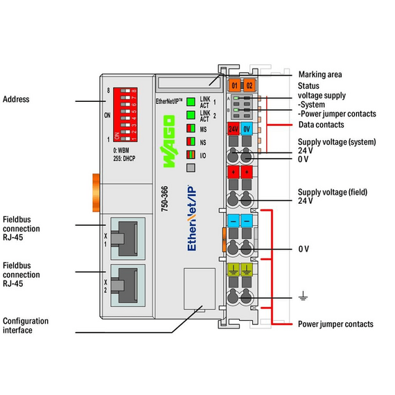 Acoplador de Bus de Campo EtherNet/IP / 4ª Generación / Protocolo DLR / 10-100 Mbit/s / 250 Módulos Máx. / IP20 / Montaje Carril DIN 750-366