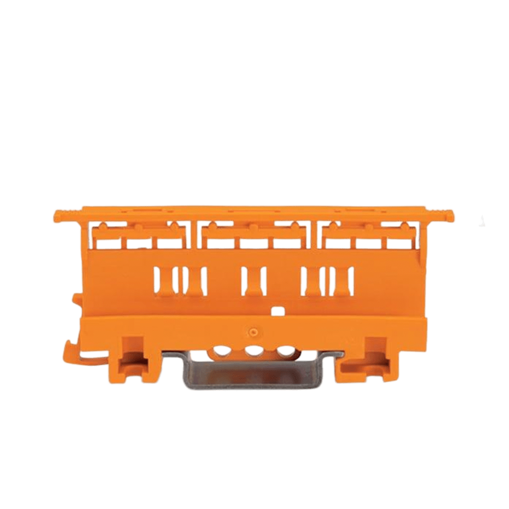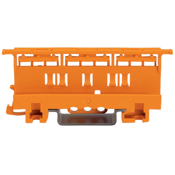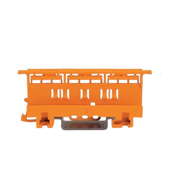 Adaptador de fijación para bornas de conexión de la serie 221 con capacidad para conductores de 6 mm². Diseñado para montaje sobre carril DIN 35 o montaje atornillado, compatible con bornas de 2, 3 y 5 conductores. Fabricado en poliamida PA 66 con clasificación de inflamabilidad UL 94 V0, garantizando alta resistencia al fuego y durabilidad. Incluye sistema de comprobación de conectores mediante puntos de prueba superiores. Color naranja para fácil identificación en instalaciones eléctricas industriales.