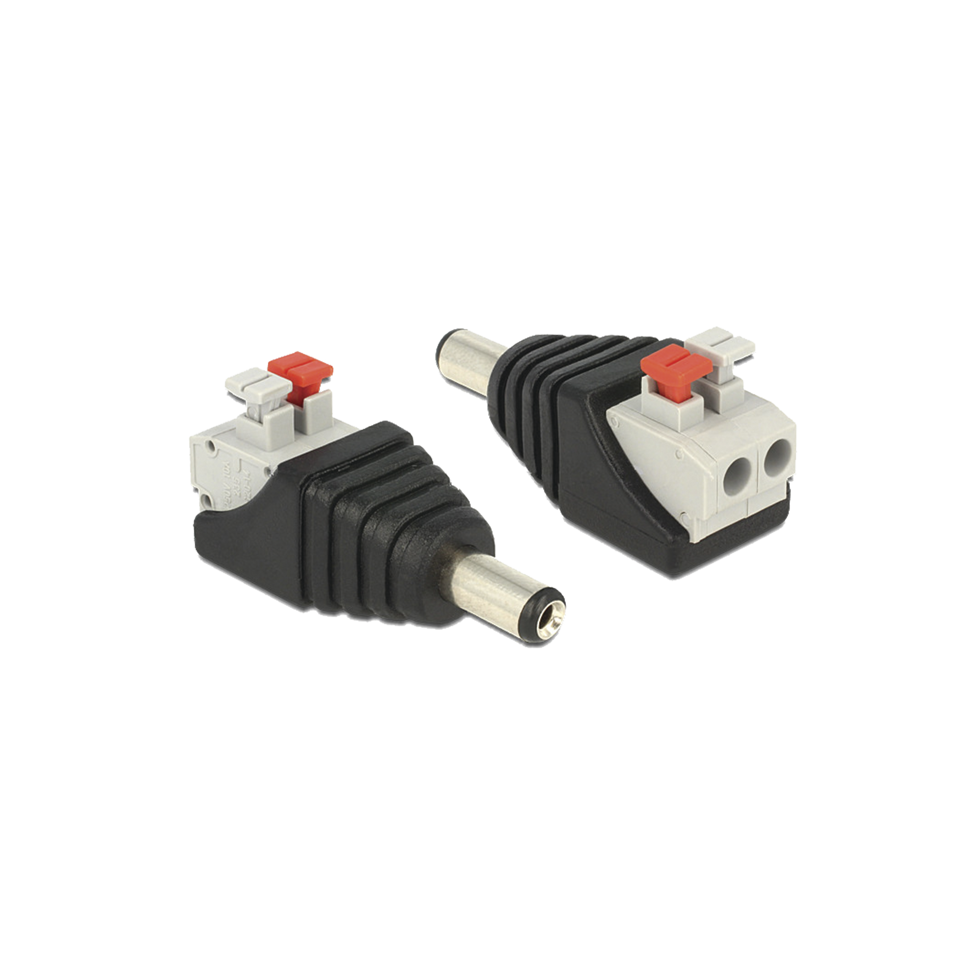Adaptador tipo jack de 3.5 mm macho polarizado de 12 Vcc con terminales tipo push.