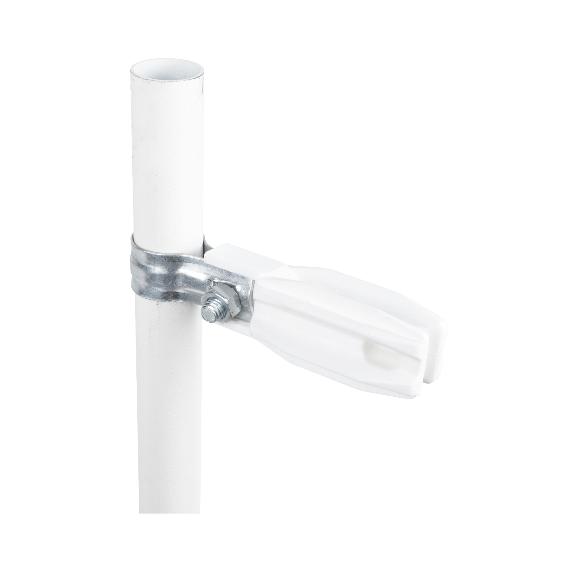 Aislador de paso o esquina de color BLANCO con abrazadera incluida de 1 Pulgada para uso en poste cerco eléctrico SFABRAZADERA1PW