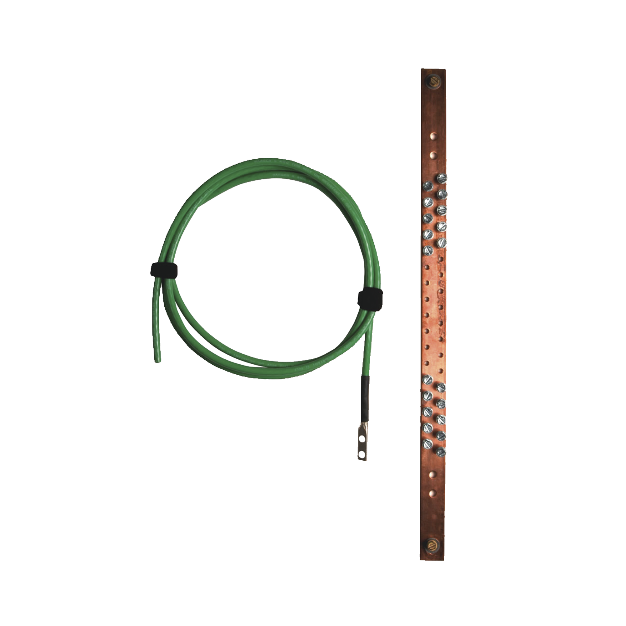 El Kit de puesta a tierra incluye una barra de cobre, cable calibre 6 AWG de 2 metros de largo terminado en un extremo con terminal de compresión de barril largo y orificio doble, hardware y accesorios de montaje.