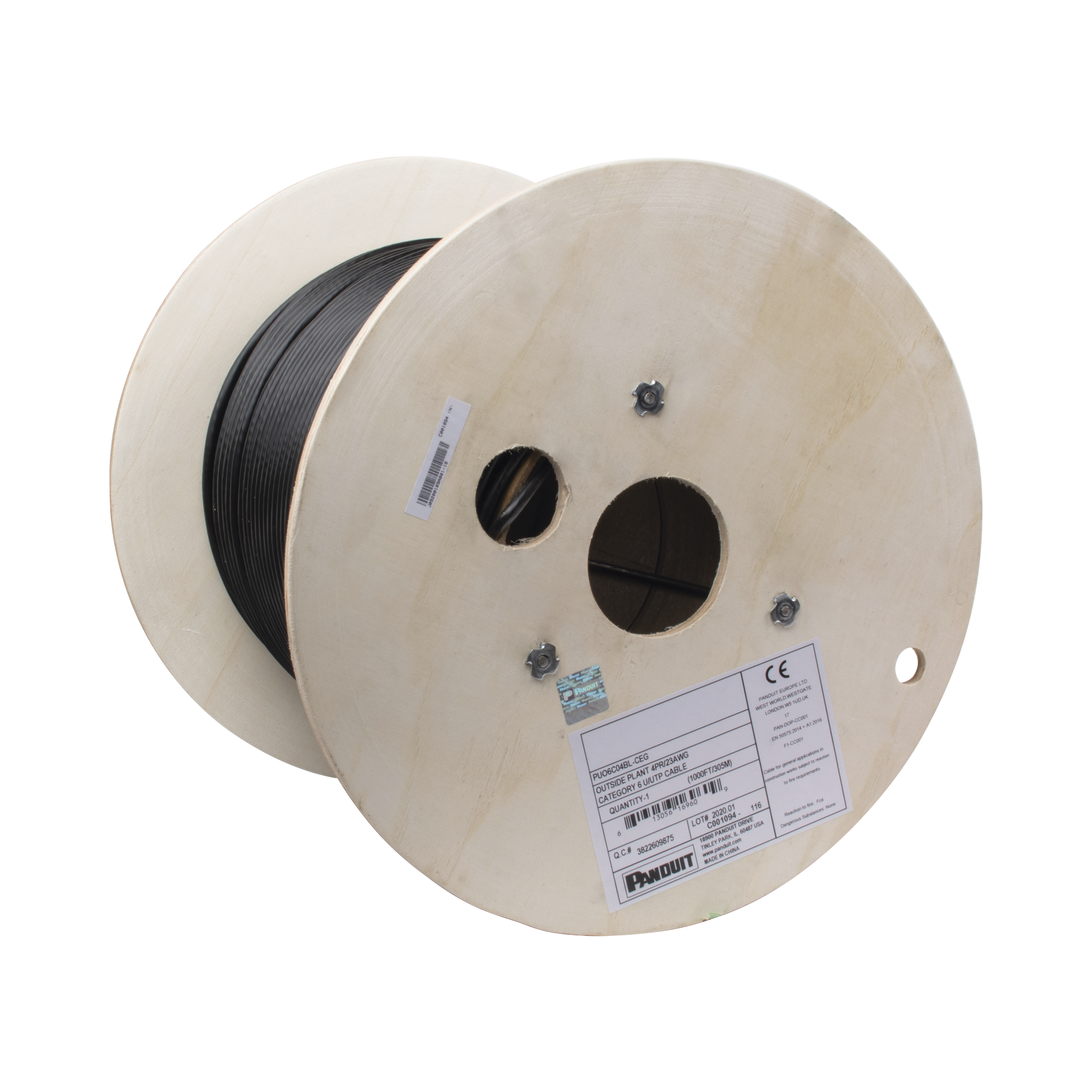 Bobina de Cable UTP de 4 Pares, PanNet, Para Exterior con Gel, Cat6 (23 AWG), Industrial para Climas Extremos, Color Negro, 305 Metros (1000 Pies) PUO6C04BL-CEG