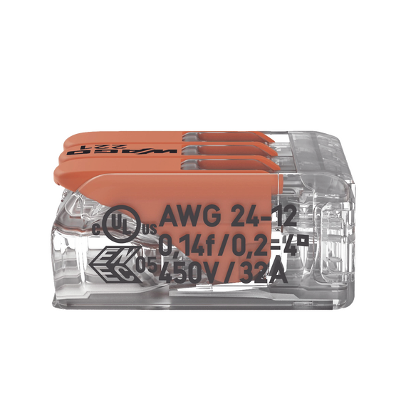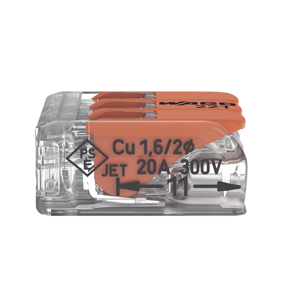 Borna de Conexión con Palancas, 3 Conductores, 4 mm² Máximo, CAGE CLAMP, Transparente, 32A 450V, T85, Palanca Naranja 221-413