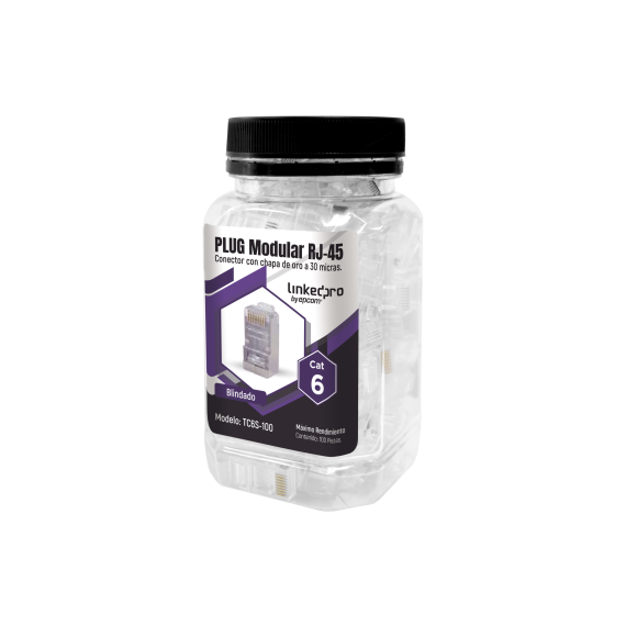 Bote con 100 Piezas de Plug Modular RJ45 Cat6 Blindado, Chapado de Oro a 30 Micras para Durabilidad Extrema SIN PIN de Tierra TC6S-100
