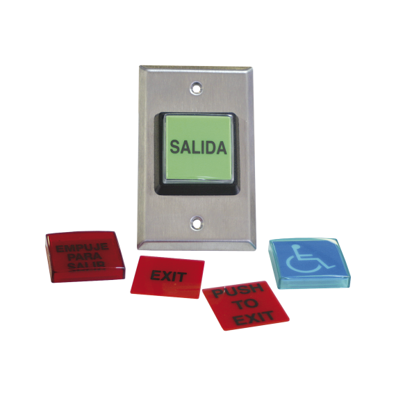 • Placas seleccionables con mensaje y una con símbolo para discapacitados: Presione para salir, Salir, en español e inglés y símbolo para Discapacitados.