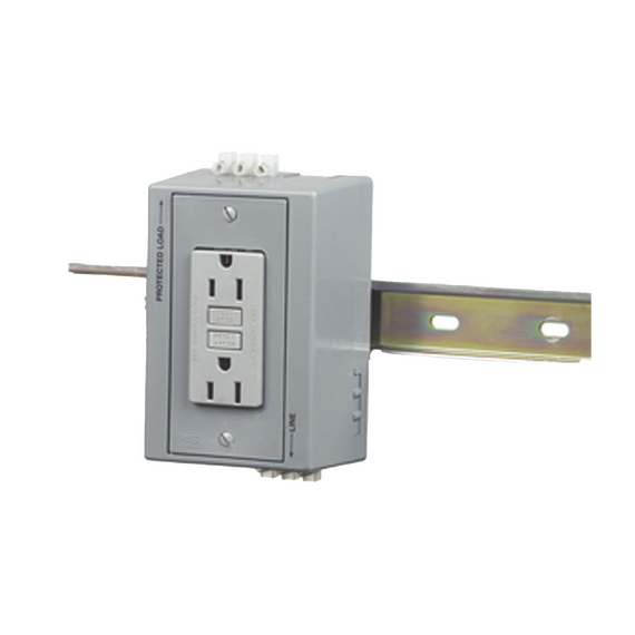 Caja Utilitaria para Montaje en Riel Din con Contacto Duplex de 15 A 125 V / Nema 5-15R / Gris. HUB-DRUB-GFI15