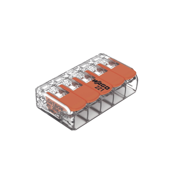 Conector Eléctrico con Palancas WAGO 221-415, 5 Conductores, 32A 450V, CAGE CLAMP®, Policarbonato Transparente, T85, UL/ENEC Certificado 221-415