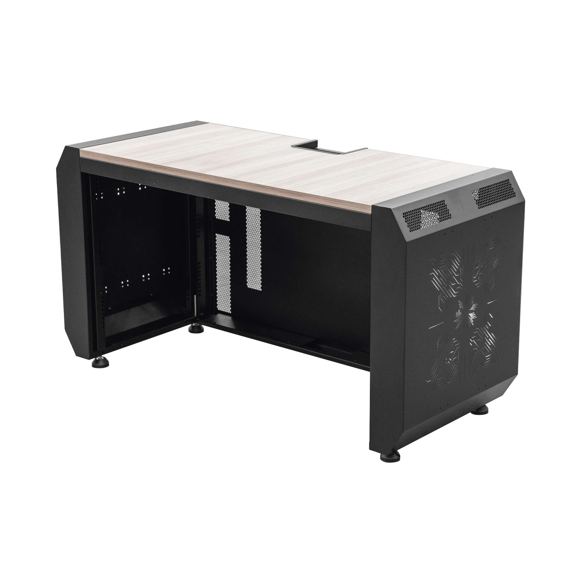Consola Profesional para Monitoreo o Computo | Ranura para Base de Monitores | Microperforaciones | Luces LED Decorativas | Tomacorriente HTCM1U10C | Tapas Organizadoras de Cables | Niveladores | Rack para Montaje de Equipos | Ranura Pasaca EMS03