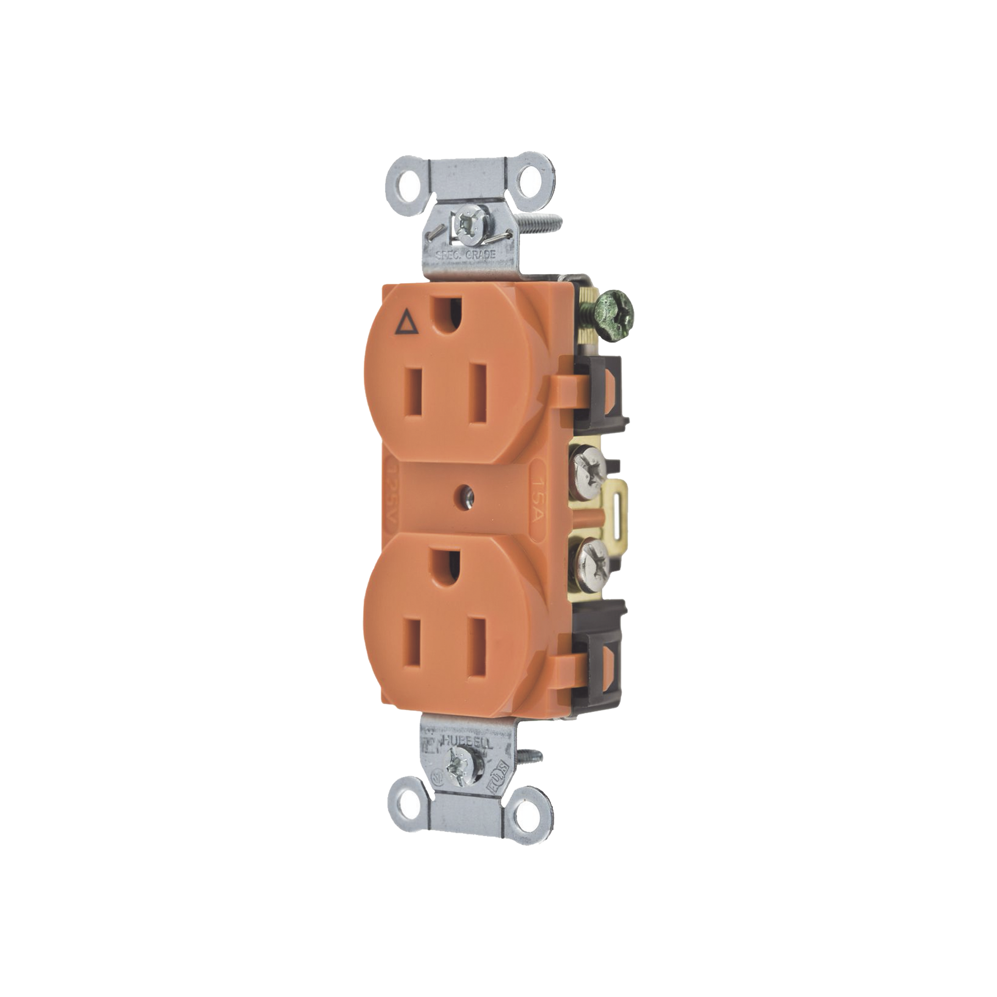 Contacto dúplex, grado comercial, 2 polos, 3 cables, 15A 125V, NEMA 5-15R, color naranja.