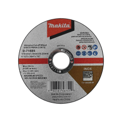 DISCO DE CORTE PARA ACERO INOXIDABLE MAKITA 4 1/2"   Diámetro: 4-1/2 pulg (115 mm) Eje: 7/8 pulg (22,23 mm) Espesor: 3/64 pulg Velocidad máxima: 4,800/min Máxima velocidad: 80 m/s