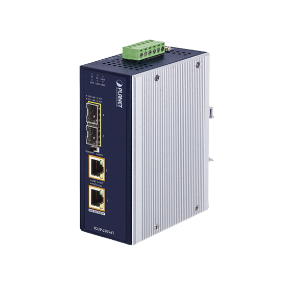 El convertidor de medios Gigabit industrial PLANET IGUP-2205AT (de 100/1000BASE-X a 10/100/1000BASE-T) con la función de inyector Power over Ethernet Plus Plus (PoE++) 802.3bt para ofrecer a ambos puertos hasta 190 Watts de potencia de salida y alta velocidad de transmisión de datos a PD (dispositivos alimentados) instalados en un área remota donde se requiere una entrada de energía suficiente y confiable. Su puerto de enlace ascendente de fibra óptica 100/1000BASE-X proporciona transmisión de datos estable, de alta velocidad y a larga distancia a una red central remota. El sistema de energía especial y conveniente del IGUP-2205AT admite entradas de energía duales de 12~56 V CC para redundancia de energía y flexibilidad operativa.
