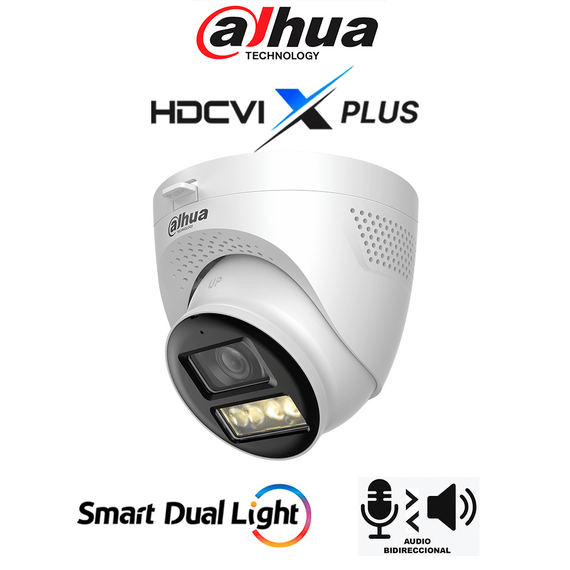 DAHUA DH-HAC-HDW1500TQN-IL-T - Cámara Domo 5MP/ Mic Integrado y Audio Bidirec/ Iluminación Dual Mediante IR y Luz Calida/ Hasta 40 Mts de Iluminación/ Lente de 2.8mm Apertura Hasta 111°/ 3DNR Para Reducción de Ruido/ IP67/ Policarbonato + Metal DH-HAC-HDW