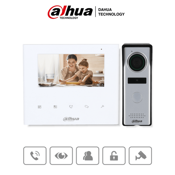 DAHUA DHI-KTA04 - Kit de videoportero analógico con monitor de 4.3" y botones táctiles. Incluye frente de calle con cámara de 1.3 MP, múltiples tonos de timbre personalizables, y función de apertura de puerta para mayor seguridad y comodidad.