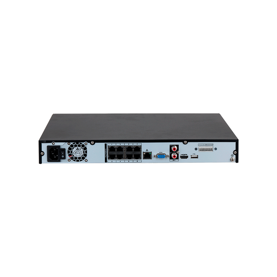 DAHUA DHI-NVR4208-8P-4KS3 NVR de 8 MP/ 4k/ 8 Canales IP/ 8 Puertos PoE/ Rendimiento de 160 Mbps/ H.265+/ 2 Bahías de discos duros / Soporta cámaras WizSense/ HDMI 4k & VGA/ 4 canales SMD Plus/ E&S de Alarma/