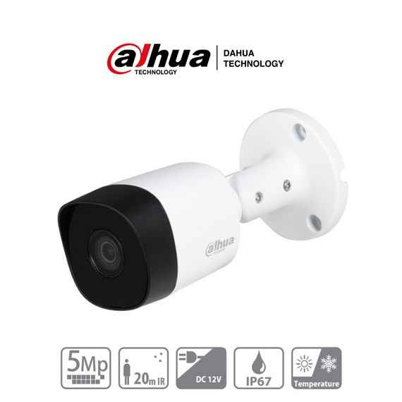 DAHUA HAC-B2A51N-0280B-S2 - Cámara bullet de 5 MP con lente de 2.8 mm y ángulo de visión de 106°. Incorpora IR de 20 m para visión nocturna, resistente IP67, y materiales metálicos. Compatible con CVI, CVBS, AHD y TVI