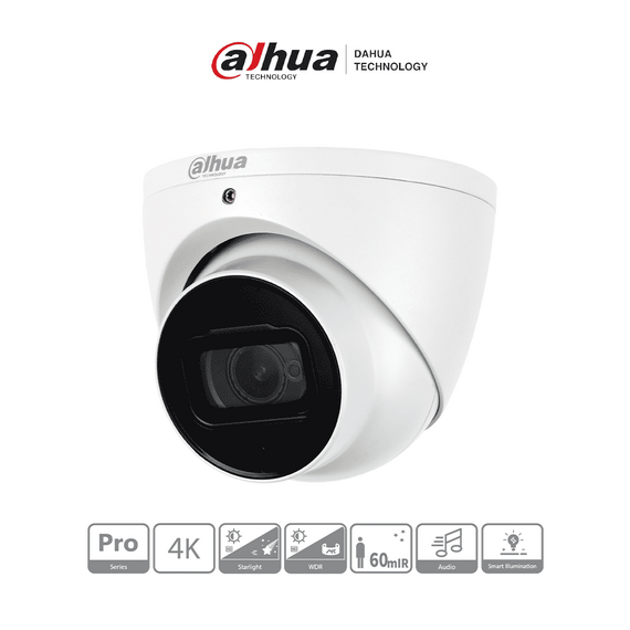 DAHUA HDW2802T-A -Cámara Domo EyeBall 4K Starlight de 8MP, lente de 2.8 mm, IR de 50m, WDR real 120 dB, IP67. Ideal para vigilancia en alta resolución con excelente rendimiento en condiciones de poca luz y protección robusta contra el clima