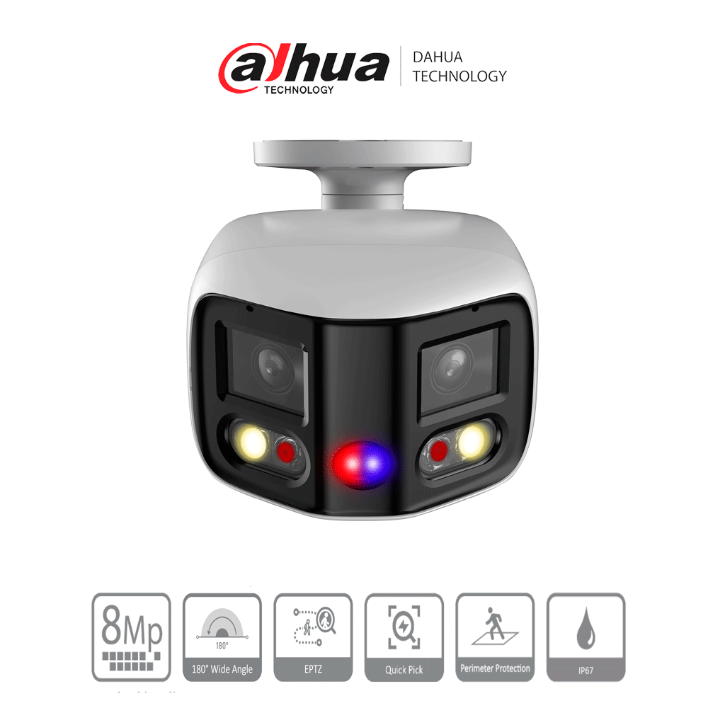 DAHUA IPC-PFW3849S-A180-AS-PV Cámara IP Bullet WizSense 2x4MP con visión de 180°, MultiVision, LED IR 25m y luz cálida 20m. Disuasión activa con micrófono dual y altavoz integrado, EPTZ, SMD 4.0, PoE, IP67, y ranura MicroSD. Ideal para seguridad avanzada.