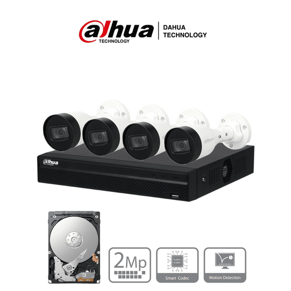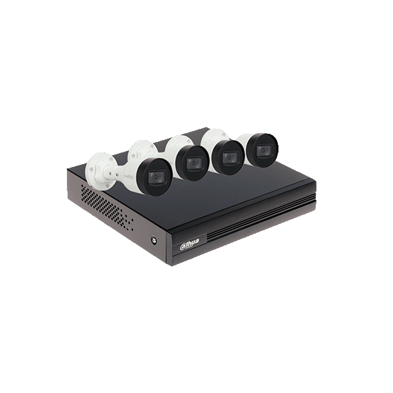 DAHUA KITNVR1104HS-P+4C1TB- Kit IP de 4 canales con NVR con 4 puertos PoE, 1TB de almacenamiento, y 4 cámaras bullet de 2MP con IR de 30 metros y clasificación IP67 para exteriores. Ideal para una vigilancia eficiente y robusta.