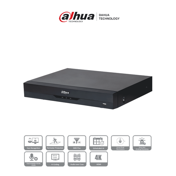 DAHUA XVR5116HE-4KL-I3 - DVR 16 Canales 4K con IA, WizSense, H.265+, 16 Canales + 16 IP (32 Ch máx.), Reconocimiento Facial, SMD Plus, Protección Perimetral, 16&3 E&S Alarma, 1 Puerto SATA. DH-XVR5116HE-4KL-I3