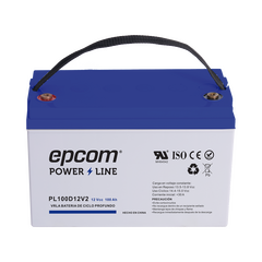 PL10012D12V2 Batería AGM-VRLA de 12 Vcc; 100 Amper Hora La serie de baterías EPCOM POWER LINE, están diseñadas con tecnología AGM-VRLA (Fibra de vidrio absorbente, con válvulas de regulación), placas de alto rendimiento y electrólito para proporcionar una salida de...