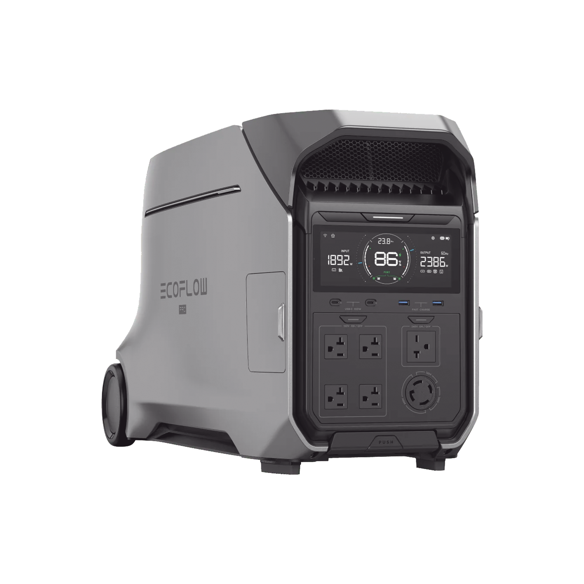 Estación de Energía Portátil DELTA PRO3 / 4096Wh Litio LFP / 5 AC 4000W (8000W Pico) / 2 USB-C 100W / Capacidad para Aumentar Respaldo / Cargador de Coche 10A a 12.6V / Conectividad WiFi y Bluetooth (App) / Carga Solar 2600W Max. (2 P EFD521