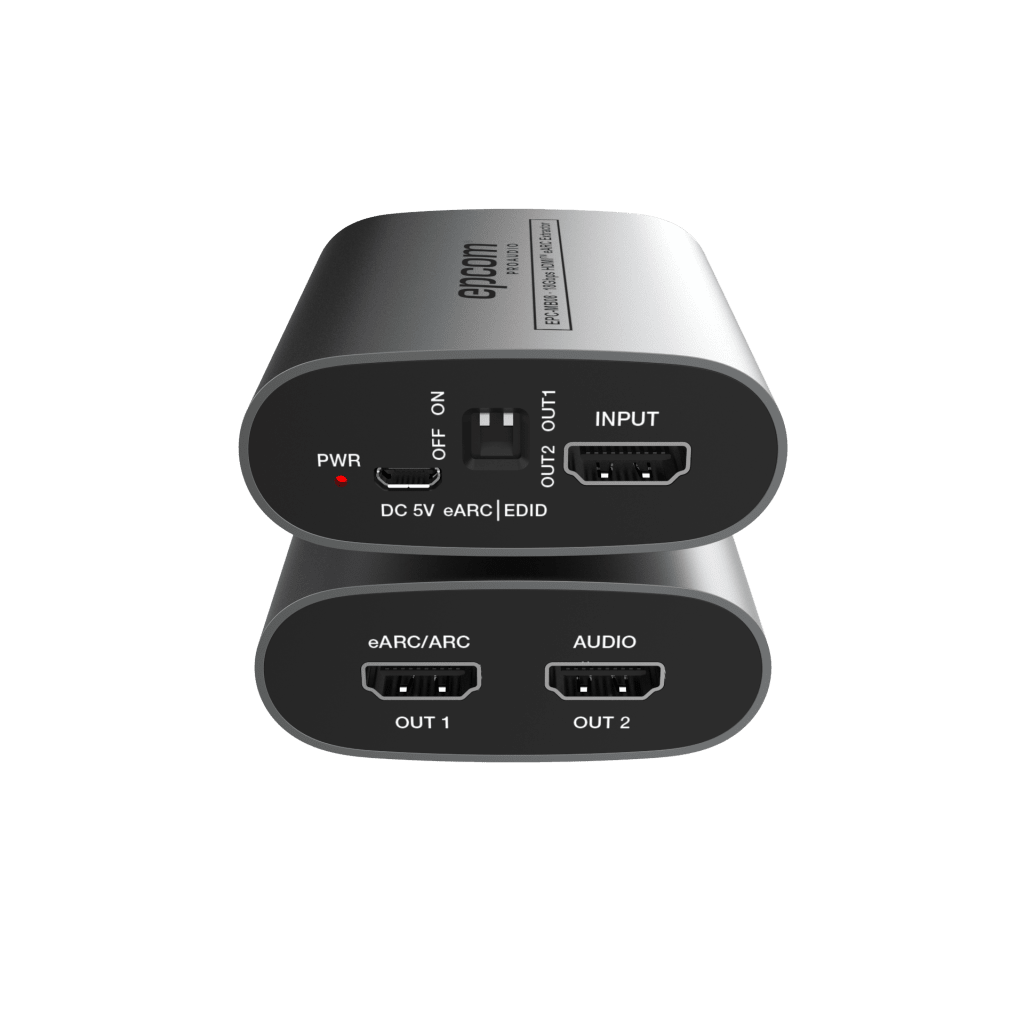 Extractor de audio eARC HDMI profesional con velocidad de transferencia de 18 Gbps. Diseñado para sistemas de audio digital de alta fidelidad, compatible con resoluciones 4K HDR. Permite extraer el canal de audio desde señales HDMI con tecnología eARC (Enhanced Audio Return Channel). Dispositivo compacto y portátil ideal para integración en sistemas de home theater profesional, estudios de grabación y aplicaciones de audio broadcasting. Soporta múltiples formatos de audio digital incluyendo Dolby Atmos, DTS:X y otros codecs de alta resolución.