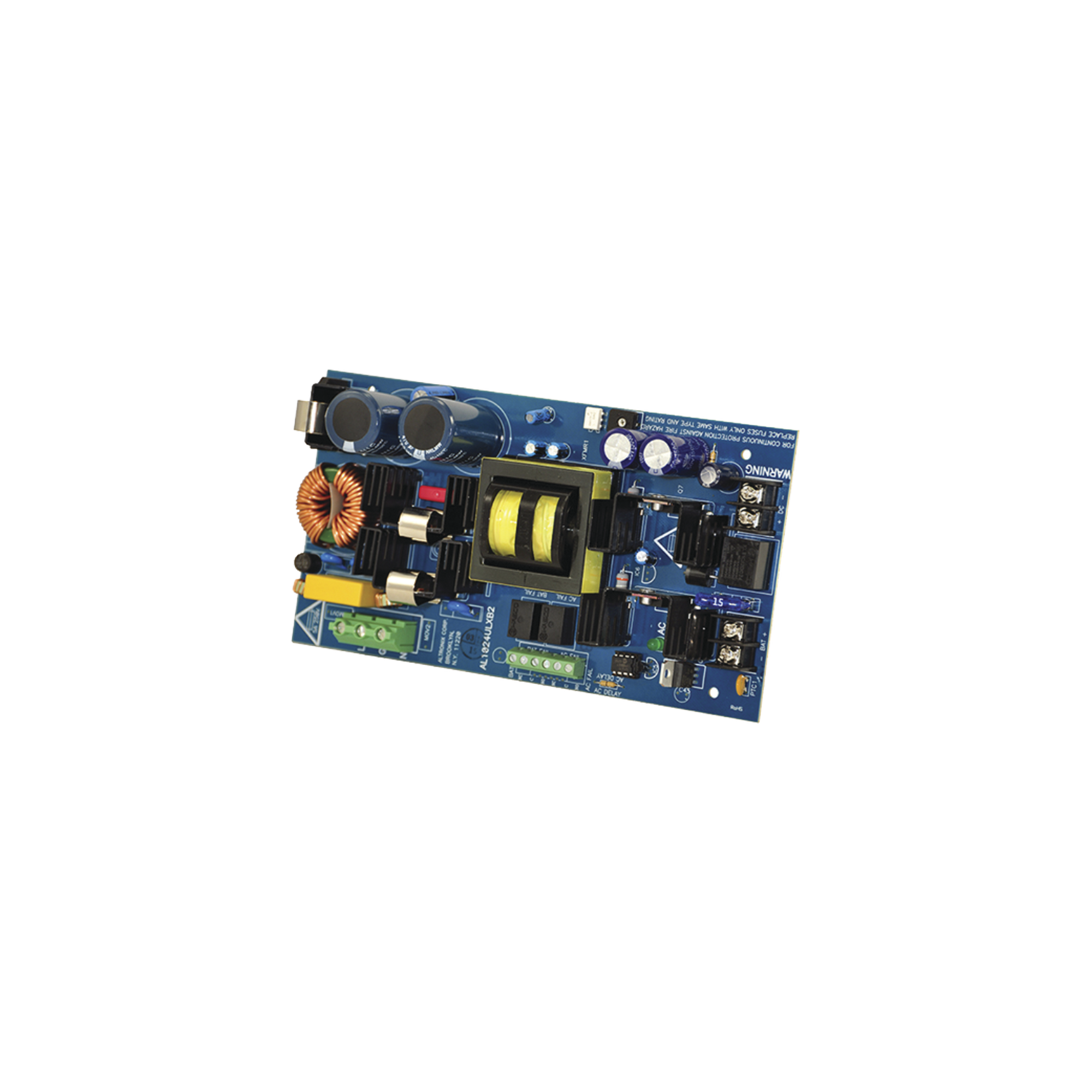 La fuente de alimentación / cargador de subensamblaje listado por UL convierte la entrada 115VAC, 60Hz en una única salida de 24VCC sin limitación de potencia. También ofrece un conjunto de funciones que incluyen supervisión de falla de CA, presencia de batería y supervisión de batería baja.