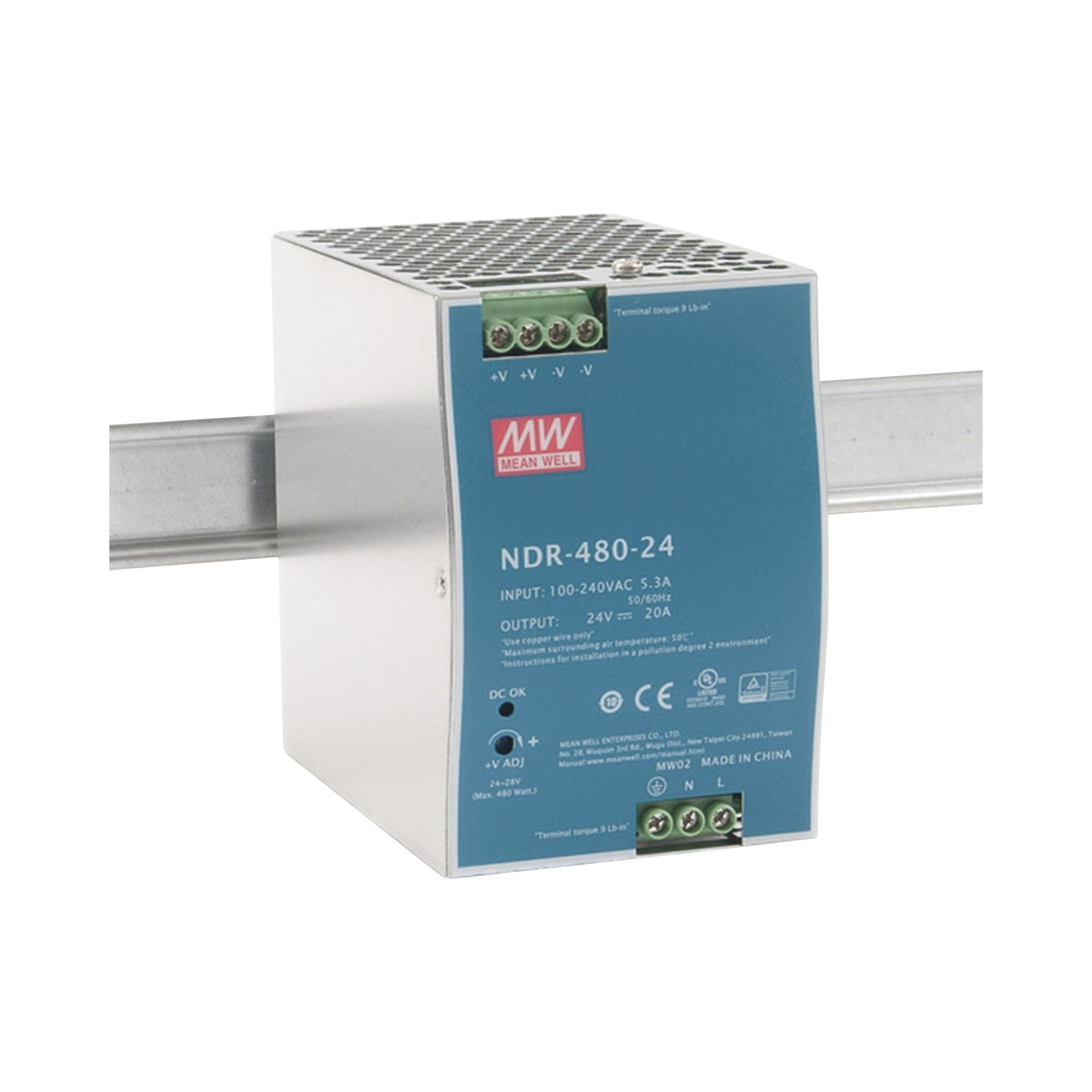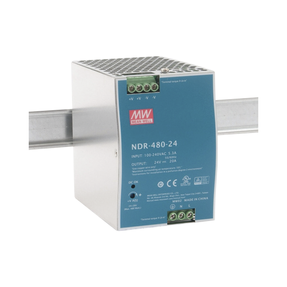 Fuente de Poder Industrial de 480W, salida 24 Vcc, para montaje en Riel Din NDR48024