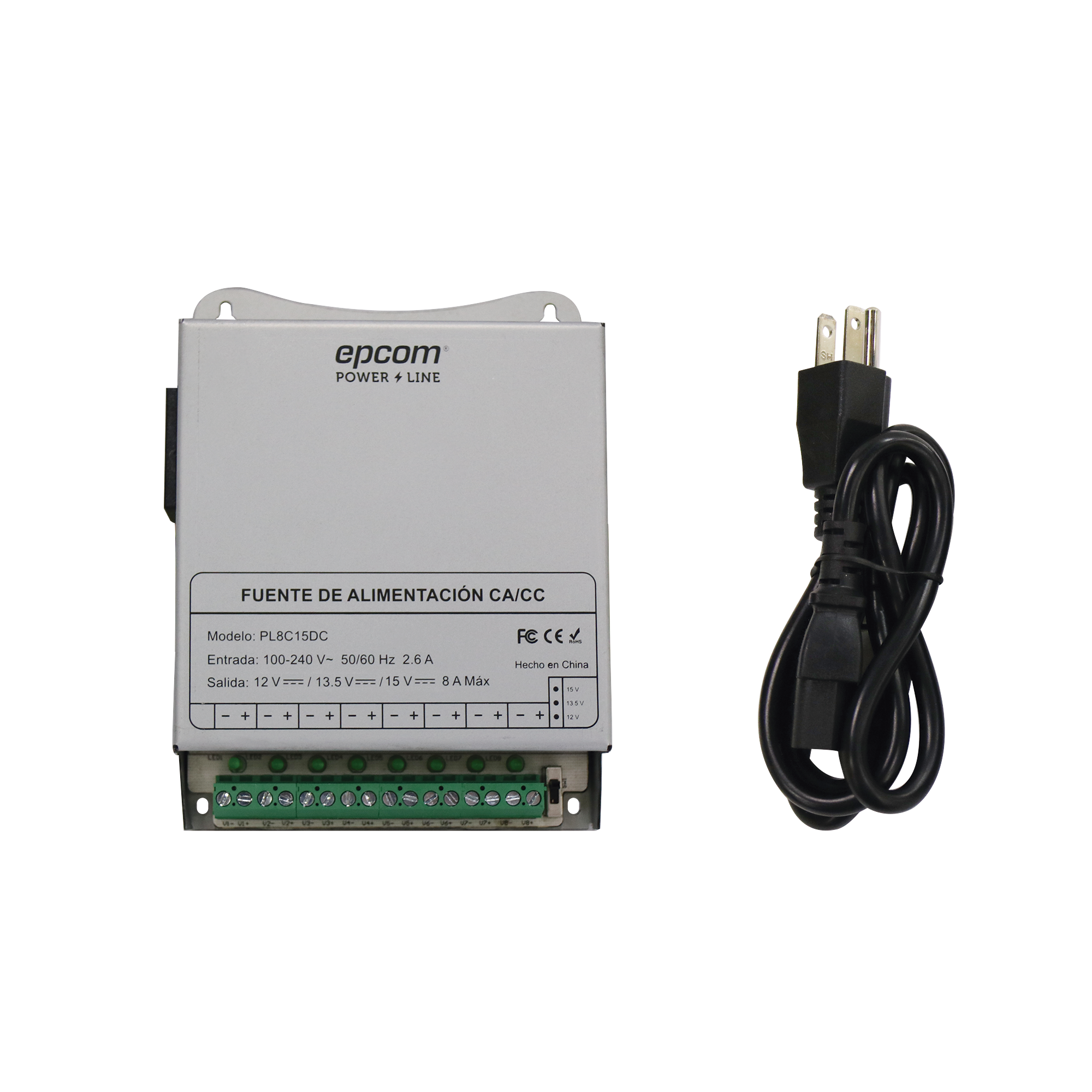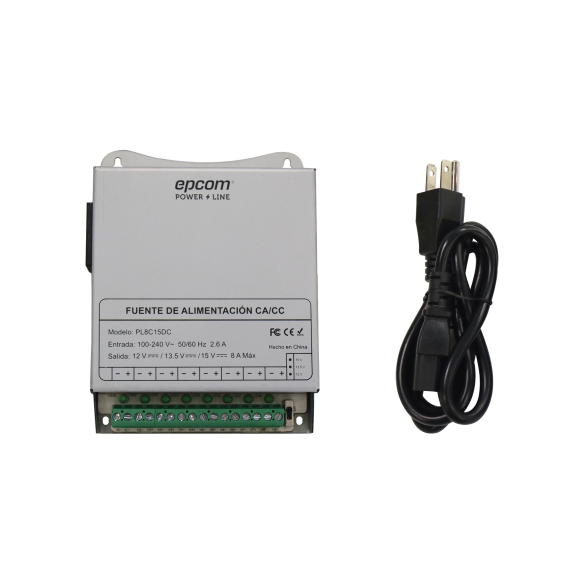 Fuente de Poder Metálica / Para 8 Cámaras / Ajustables a 12 o 13.5 o 15 Vcc / 8 Amperes / Instalación en Pared. PL-8C-15DC