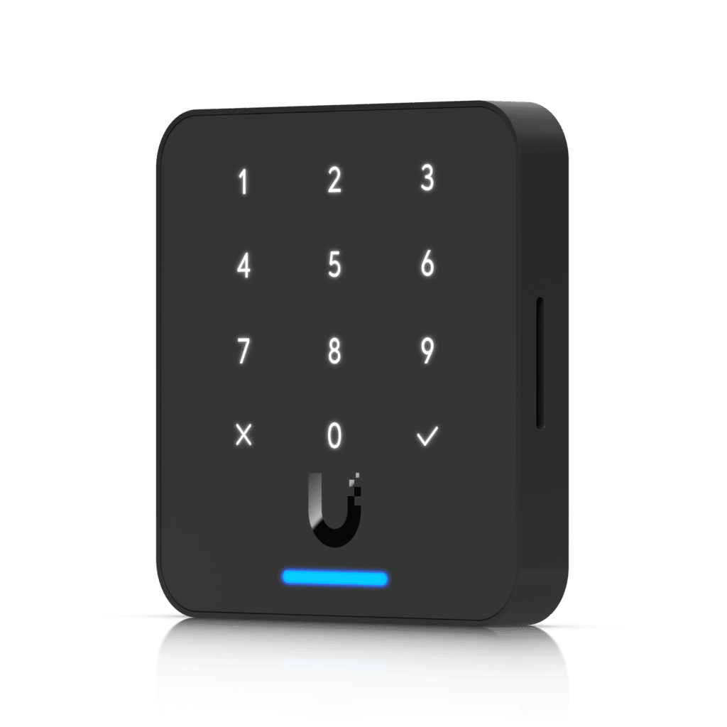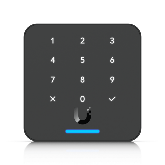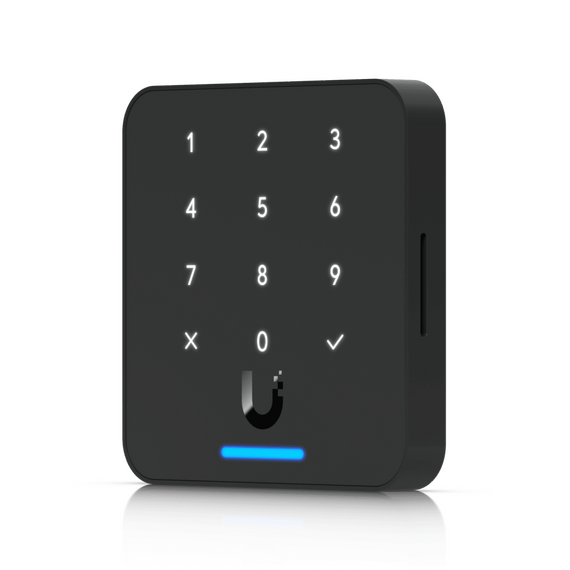 Lector de acceso compacto con teclado capacitivo de 12 botones, soporte para tarjetas y llaveros NFC, Apple Wallet / Google Wallet y desbloqueo móvil, ideal para instalaciones UniFi Access en interior o exterior.