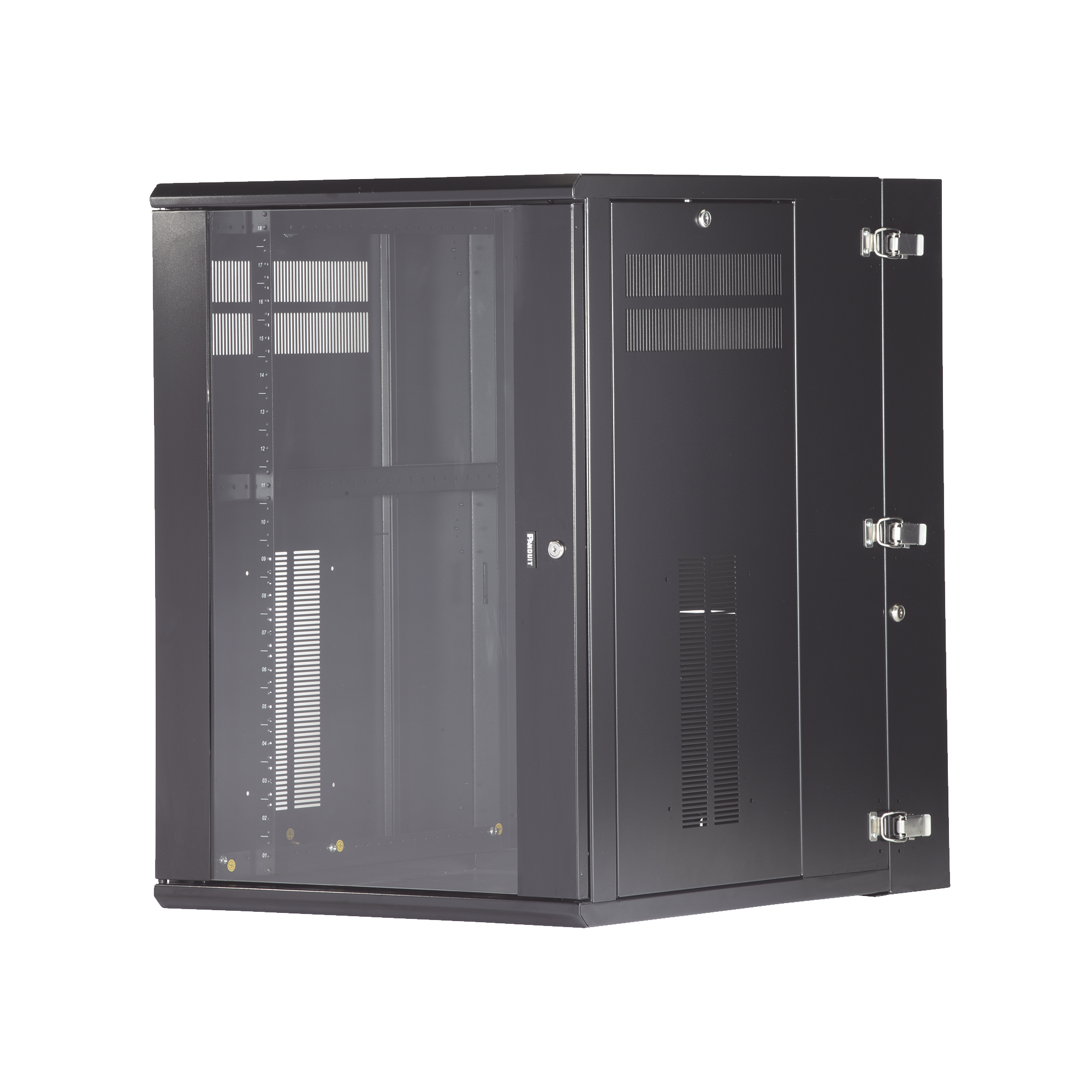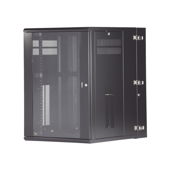 Gabinete de montaje en pared construido en acero, soporta 18 unidades de Rack para equipos de red activos o pasivos. Cuenta con paneles laterales totalmente desmontables y está diseñado para permitir el control de clima adecuado para uso con diversos equipos de red, así como Switches de alimentación remota (PoE) y fuentes de alimentación ininterrumpida (UPS).