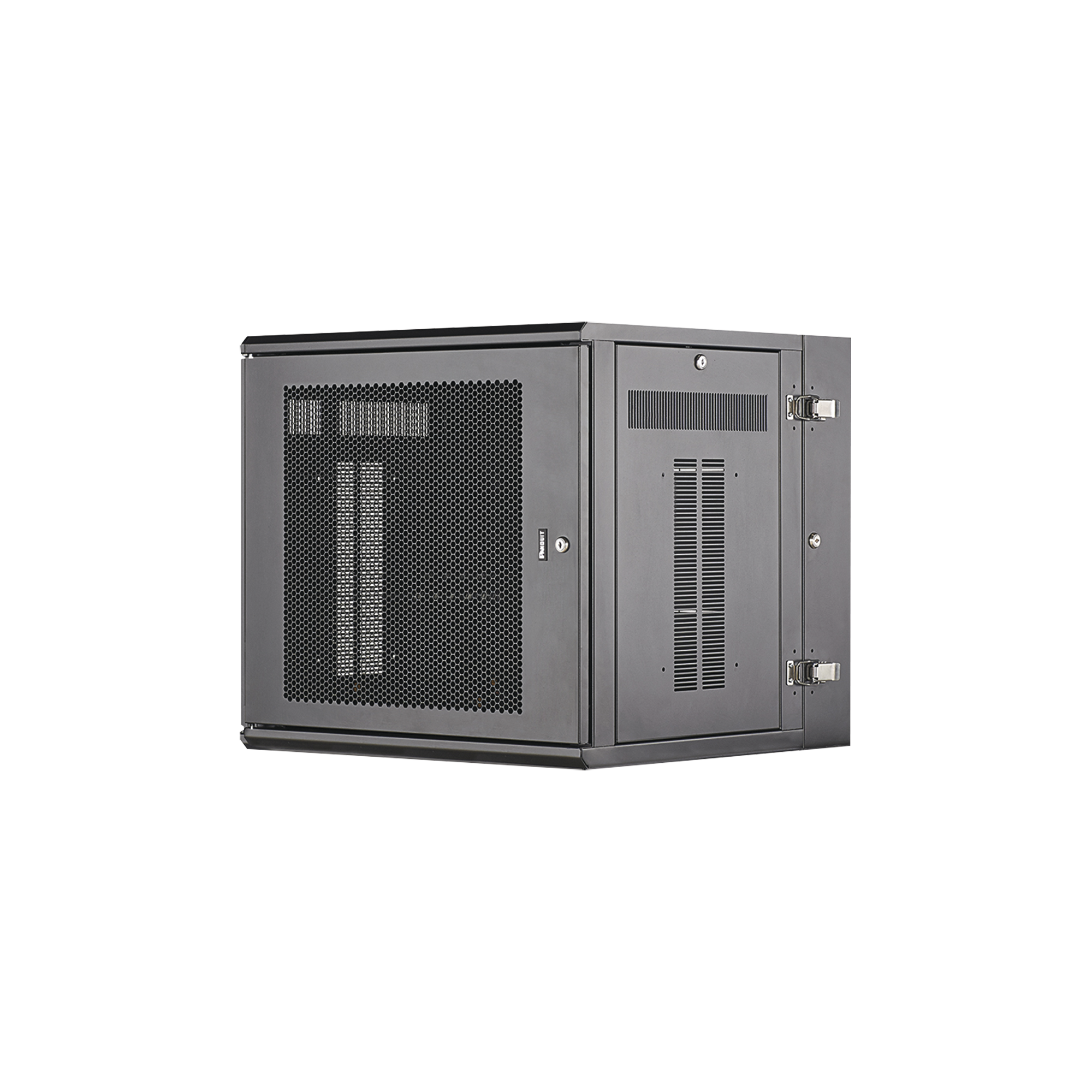Gabinete de montaje en pared construido en acero, soporta 12 unidades de Rack para equipos de red activos o pasivos. Cuenta con paneles laterales totalmente desmontables y está diseñado para permitir el control de clima adecuado para uso con diversos equipos de red, así como Switches de alimentación remota (PoE) y fuentes de alimentación ininterrumpida (UPS).
