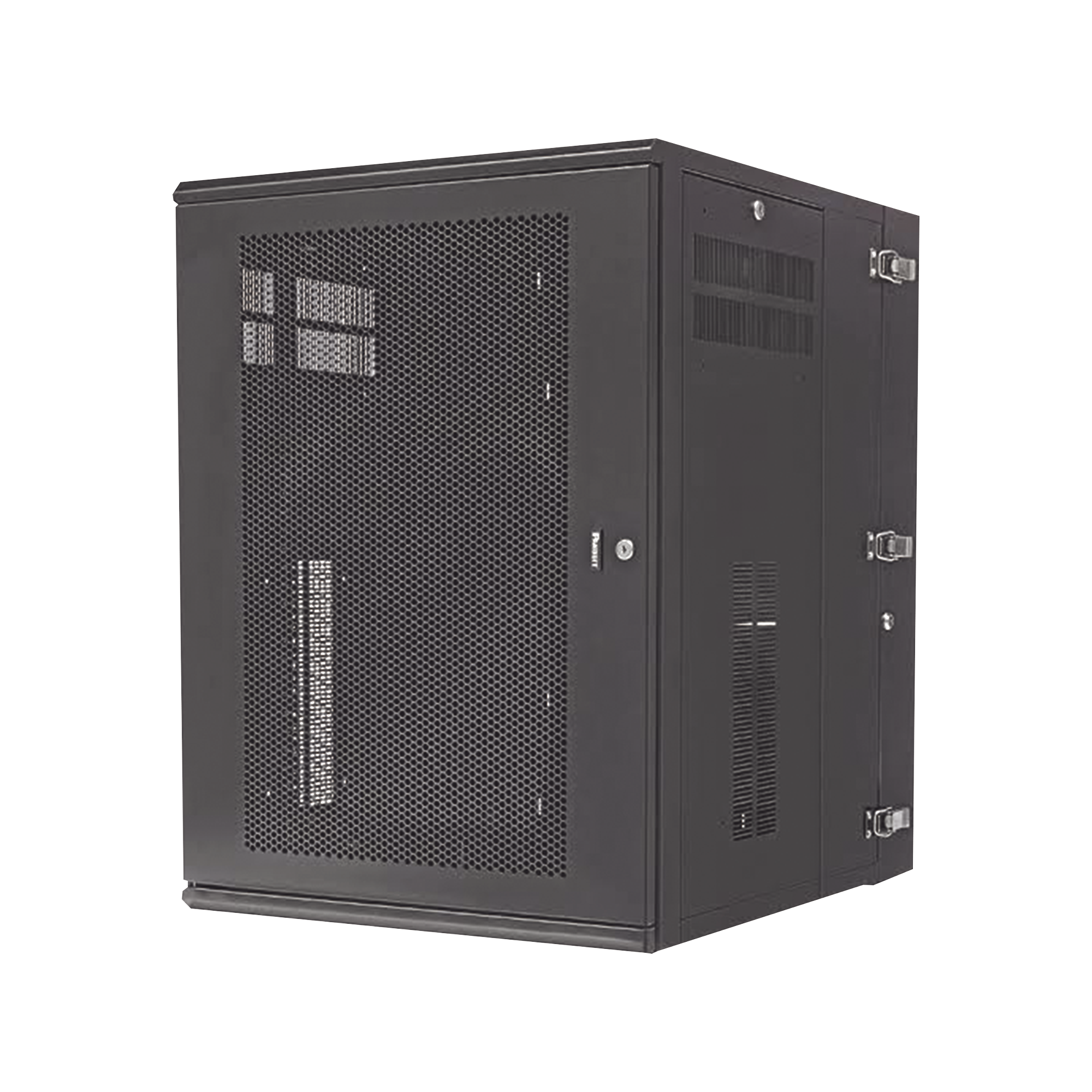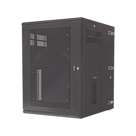 Gabinete de montaje en pared construido en acero, soporta 18 unidades de Rack para equipos de red activos o pasivos. Cuenta con paneles laterales totalmente desmontables y está diseñado para permitir el control de clima adecuado para uso con diversos equipos de red, así como Switches de alimentación remota (PoE) y fuentes de alimentación ininterrumpida (UPS).