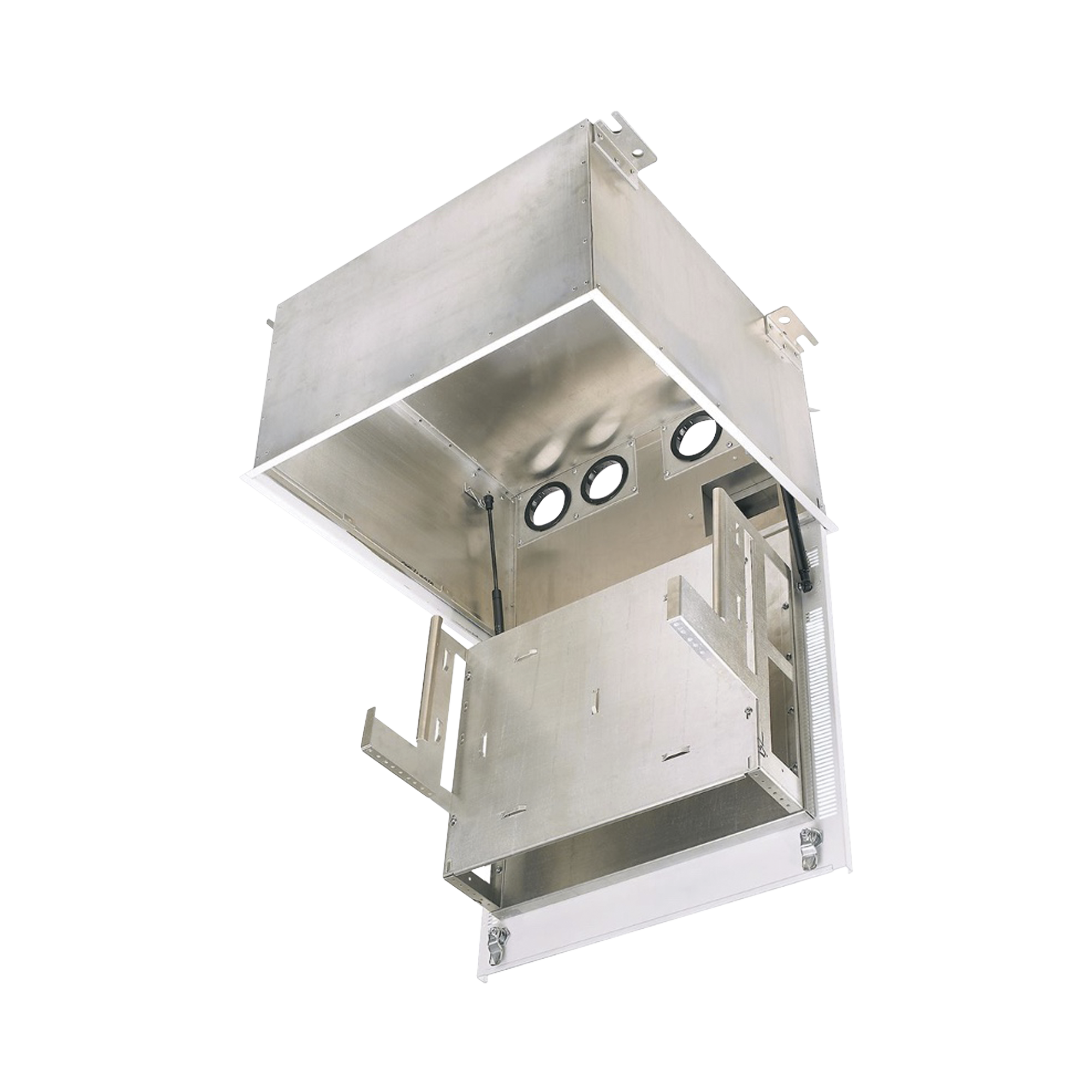 El gabinete de techo permite que los equipos de red se ubiquen convenientemente en el espacio de manejo de aire por encima de un falso techo. El gabinete de instalación en techo esta diseñado para instalar equipos que permitan una topología de infraestructura de red de cableado por zonas. El gabinete incluye un soporte de montaje TIA / EIA de 19' con dos niveles, un administrador de holgura horizontal integrado para proporcionar una solución de administración de cables todo en uno para realizar movimientos, adiciones y cambios accesibles desde el frente. El gabinete en el techo debe estar diseñado para acomodar también equipos de red pasivos que incluyen soluciones de panel de conexión 110 punchdown o TIA/EIA 19'.
