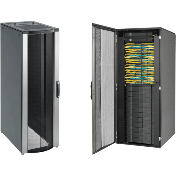 - Las puertas superior, delantera y trasera totalmente perforadas permiten el máximo movimiento de aire alrededor de cables, paneles de conexión y otros equipos de red