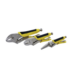Características:  Juego de 3 pinzas de presión. Fabricadas en acero al cromo molibdeno. Mangos ergonómicos de vinil aislante y antiderrapante para mejor agarre.
