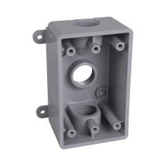 Especificaciones:  Montaje Caja Color Gris Material Plástico Número de salidas 3 Profundidad  2 in Entrada 1/2 - 3/4 in Entradas para tubería 3 de 1/2 ó  3/4 in Capacidad 16.5 in 3 Alto 4.6 in Ancho 3.
