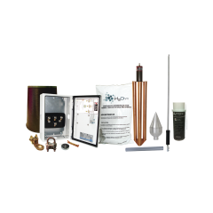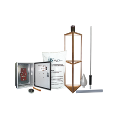 Kit completo de pararrayos con electrodo de descarga y accesorios. Ideal para sistema de elevación, torres arriostradas, torres autosoportadas, mástiles, etc. Ofrece un angulo de 72° de protección.