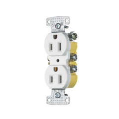 Descripción Dispositivos de hoja recta, receptáculo grado residencial, dúplex, decorador, 15A 125V, conexión a tierra de 2 polos y 3 cables, 5-15R, terminales de empuje, color blanco.