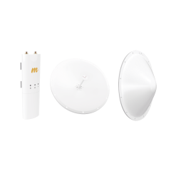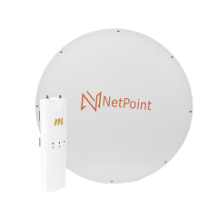 Especificaciones técnicas del kit 1 radio C5C hasta 500 Mbps de acuerdo a condiciones de los sitios y distancia del enlace. 1 antena parabólica NPX2GEN3 de 34 dBi. Distancia promedio máxima hasta 50 km con linea de vista plena.