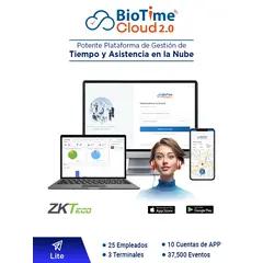 ZKTECO BIOTIMECLOUDLITE - Licencia de Asistencia en la Nube para 25 Empleados, 3 Terminales, 37,500 Eventos y 10 Cuentas de App, Suscripción por un Año