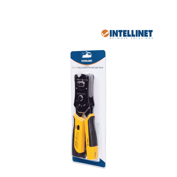INTELLINET 780124 - Pinza crimpeadora universal de plugs modulares y probador de cables 2-en-1: crimpea, corta, pela, remata y prueba.