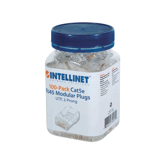 INTELLINET 790055 - Paquete de 100 conectores modulares Cat5e RJ45 / UTP, 2 pines, para cable trenzado, 100 clavijas en bote 790055