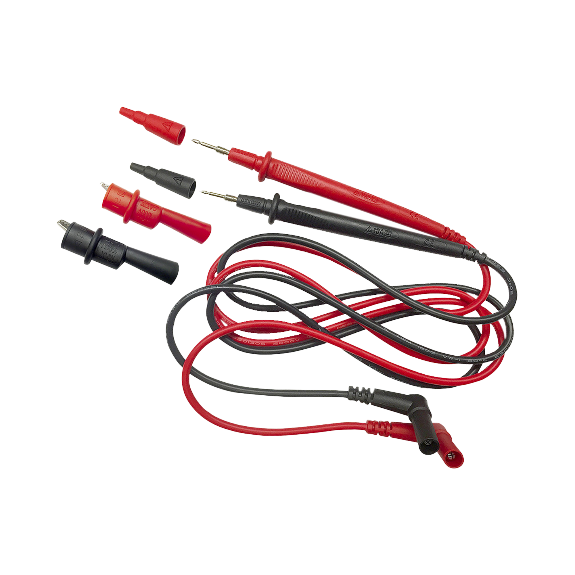 - Incluye un par de cables de prueba universales y un conjunto de pinzas tipo cocodrilo. Los cables miden 41'' (1041 mm) de largo
