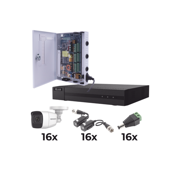 KIT TurboHD 1080p / DVR 16 Canales / 16 Cámaras Bala Policarbonato con Microfono (exterior 2.8 mm) / Transceptores / Conectores / Fuente de Poder Profesional KESTX8T16BGP/A