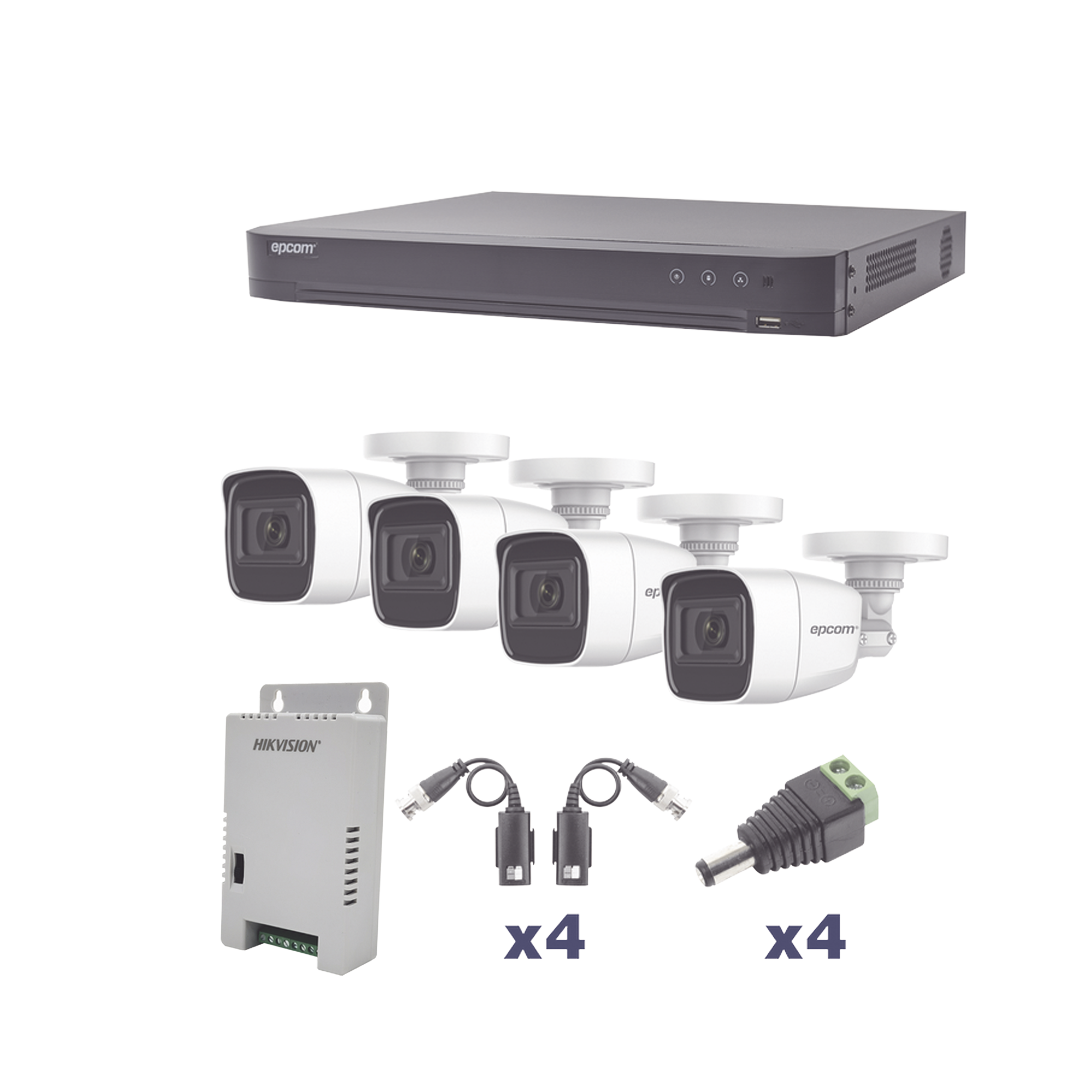 KIT TurboHD 1080p / DVR 4 Canales / 4 Cámaras Bala Policarbonato con Audio Integrado (exterior 2.8 mm) / Transceptores / Conectores / Fuente de Poder Profesional KEVTX8T4BW/A