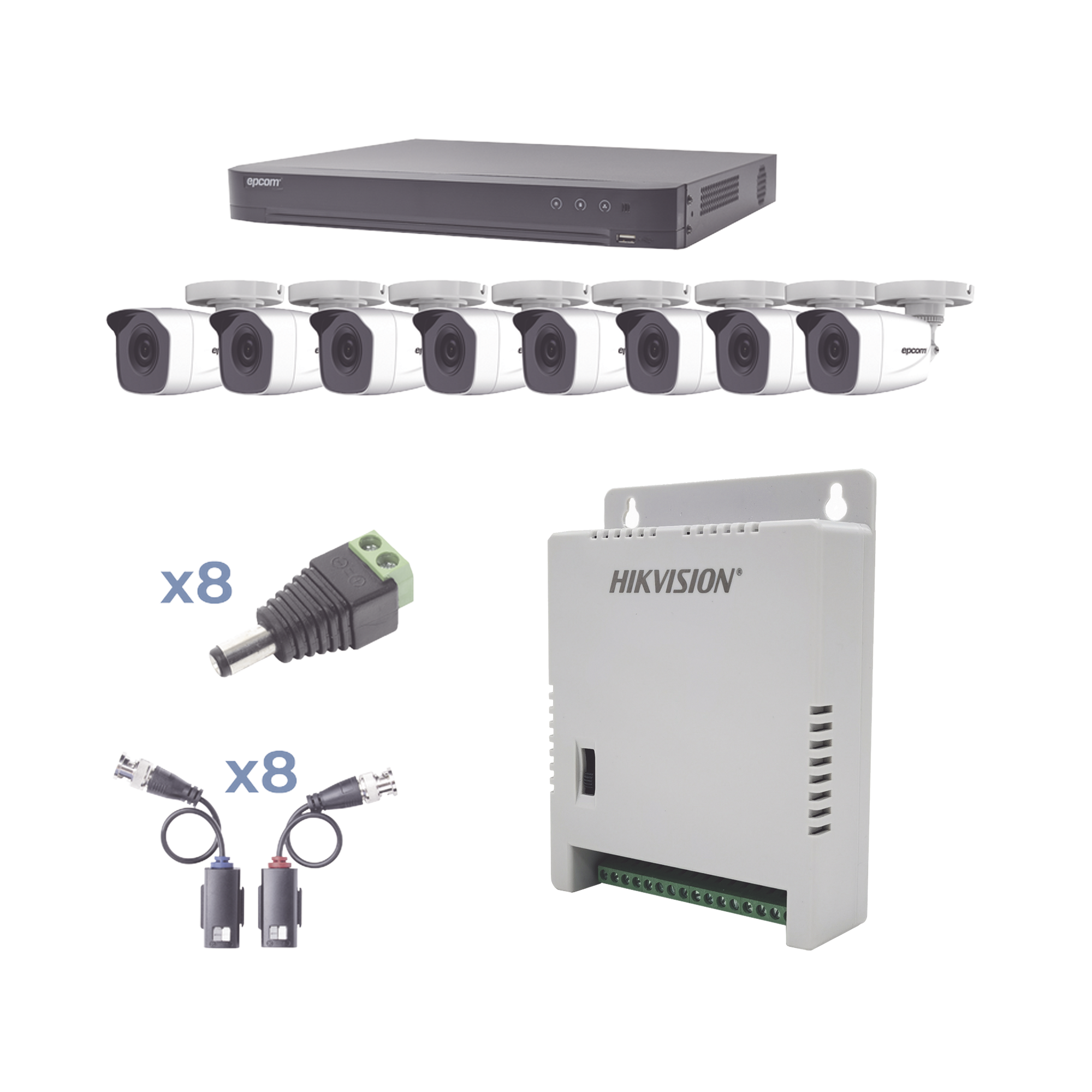KIT TurboHD 1080p / DVR 8 Canales / 8 Cámaras Bala (exterior 2.8 mm) / Transceptores / Conectores / Fuente de Poder Profesional hasta 15 Vcc para Larga Distancias KEVTX8T8BW