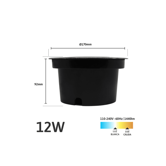 Luminario Empotrar en Piso / Uso en Exterior IP66 / Multivoltaje 110-240V~ 60Hz / Temperatura de Color 6500K / Ángulo de Luz 36° / Aleación de Aluminio y Vidrio Templado / No Dimeable JLEP-12B