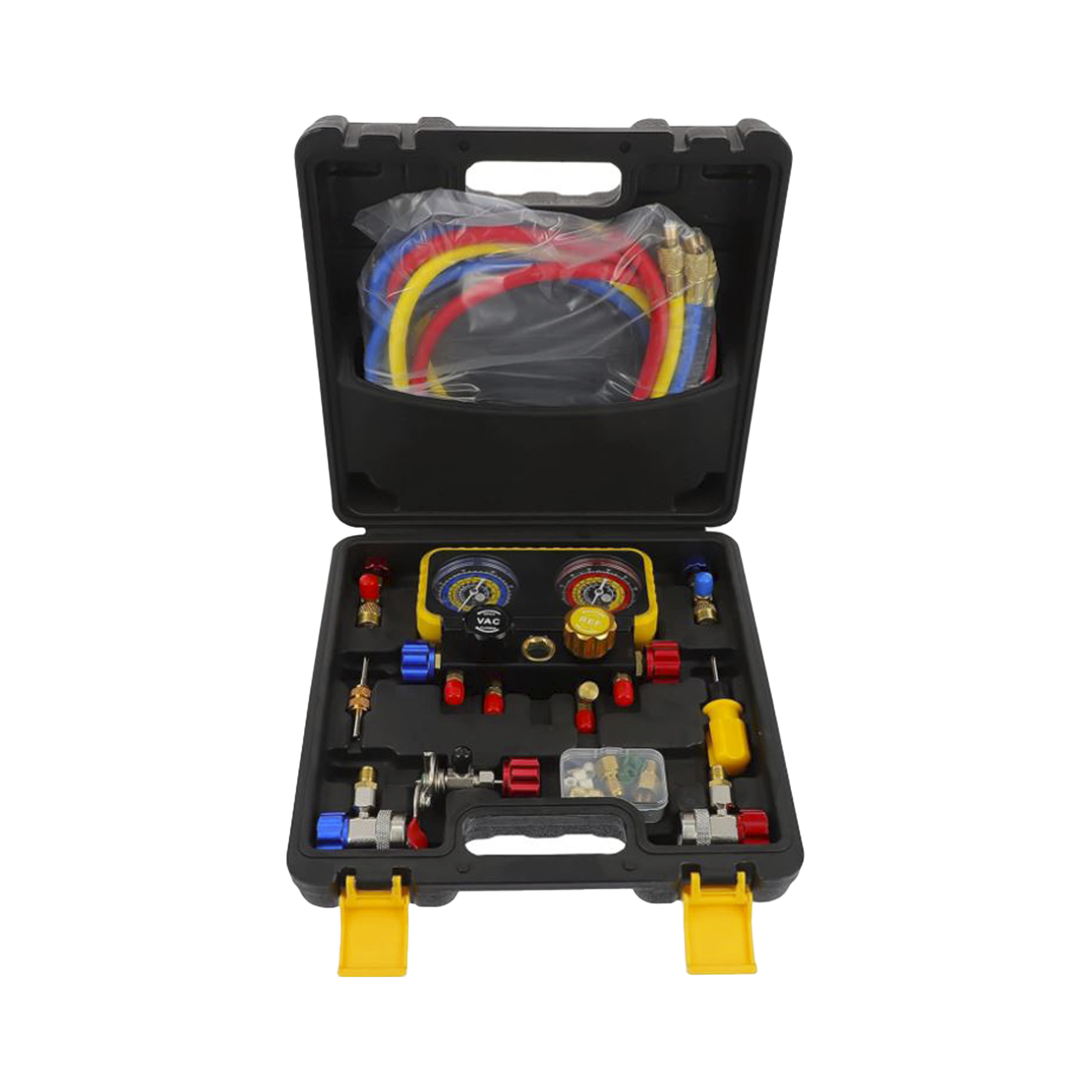 Juego de medidores de diagnóstico de colector de aire acondicionado profesional para refrigerantes R410A, R134A, R22, R32. Diseñado para carga de aire acondicionado, pruebas de diagnóstico, trabajos de recuperación y evacuación. Fabricado en materiales de alta calidad y resistencia.